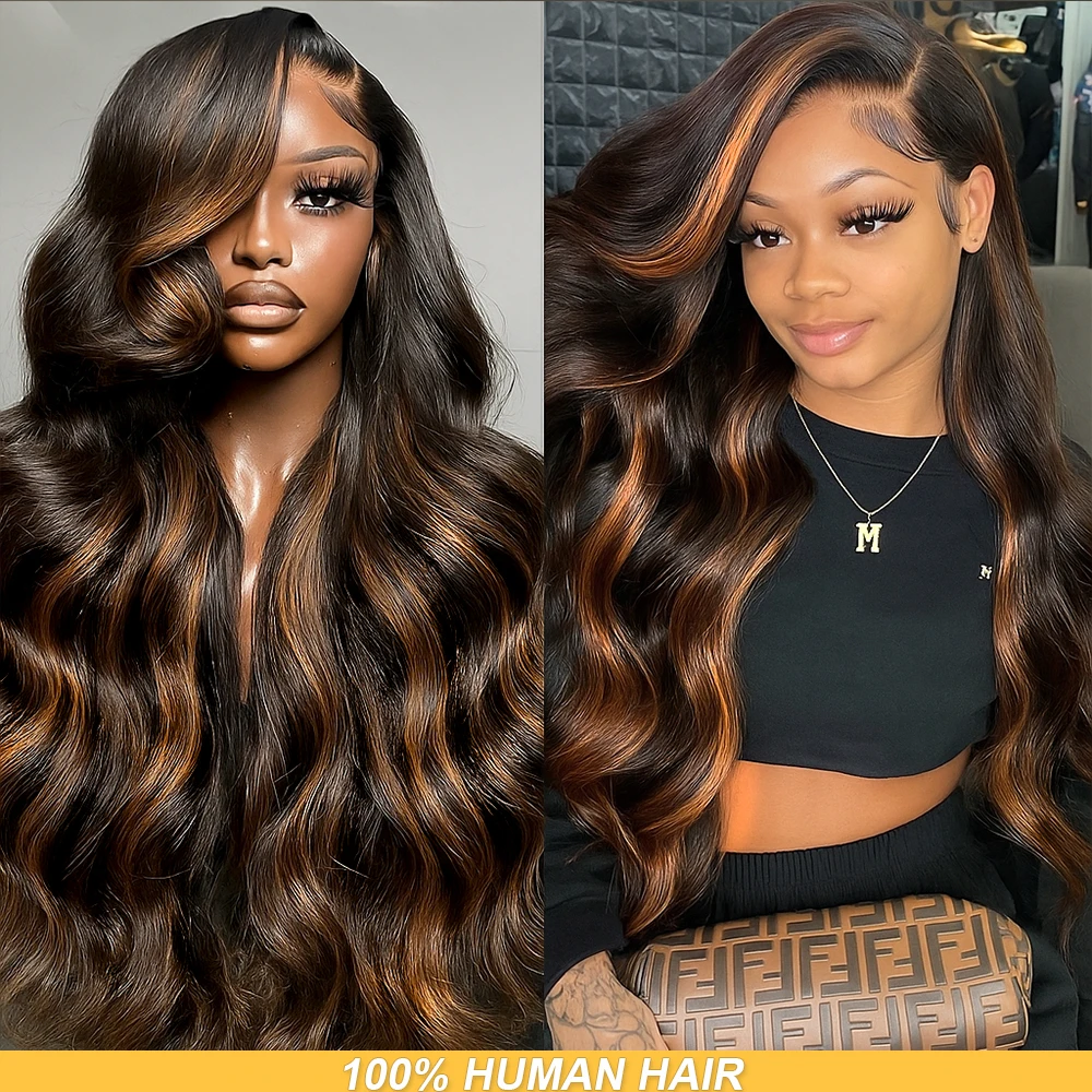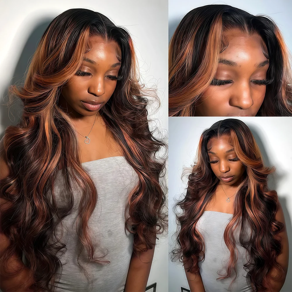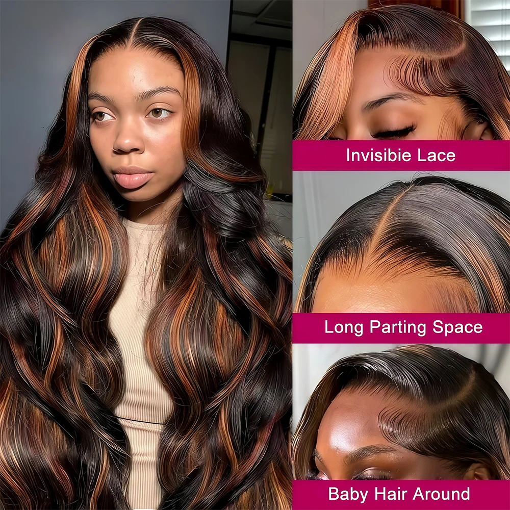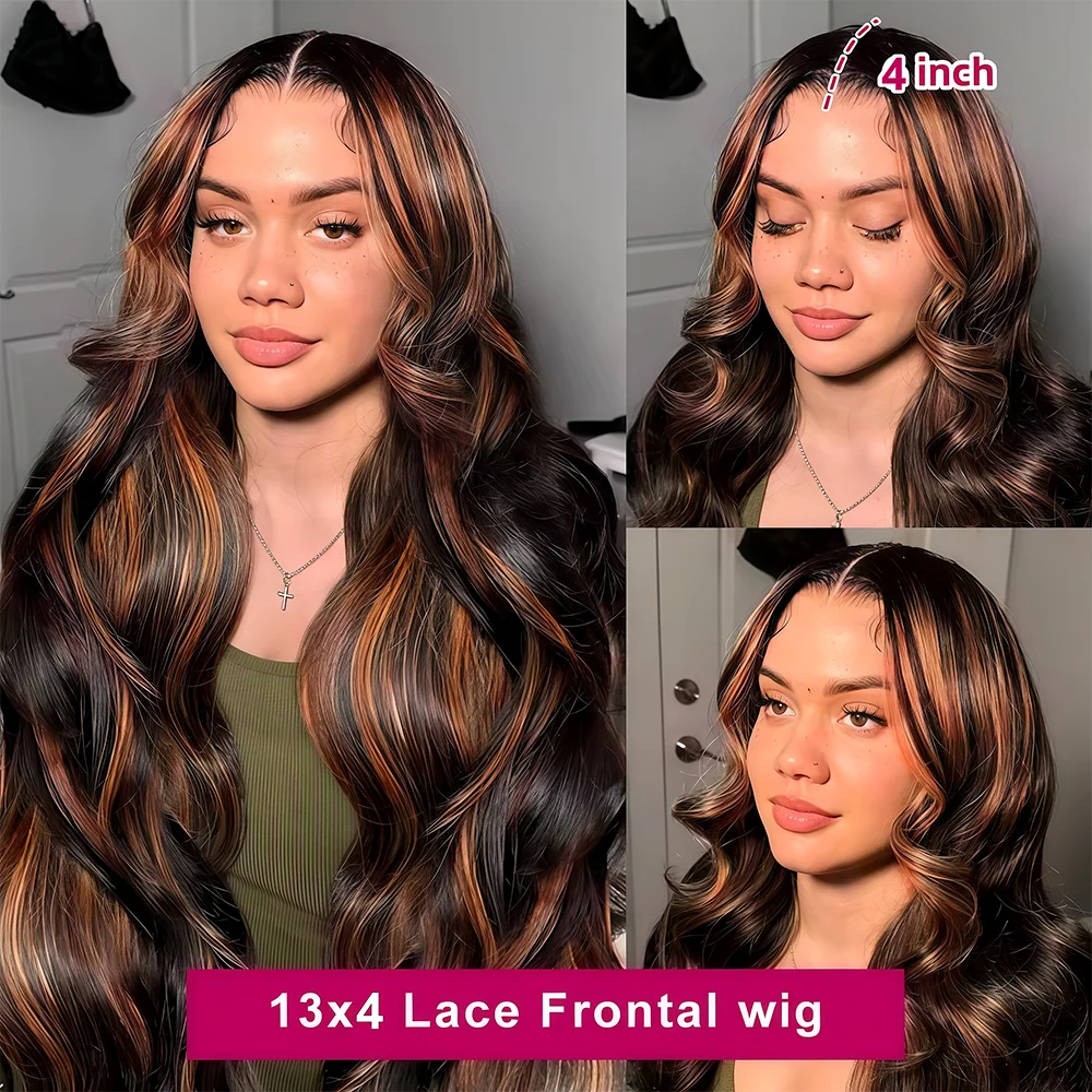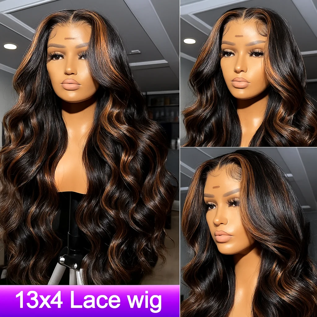 Highlight Ombre Lace Front Wigs Human Hair Body Wave Lace Front Pre Plucked 13x4 1B/30 Brown Highlight Wig 200 Density For Women