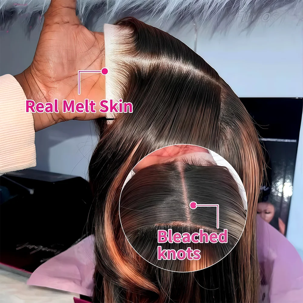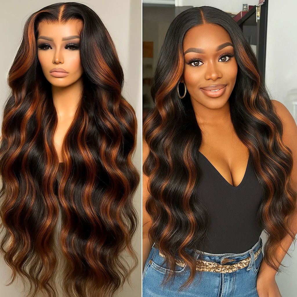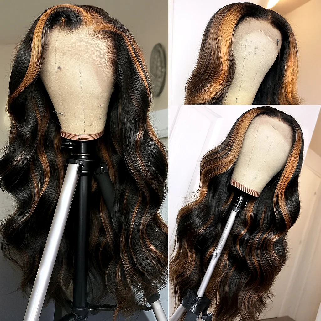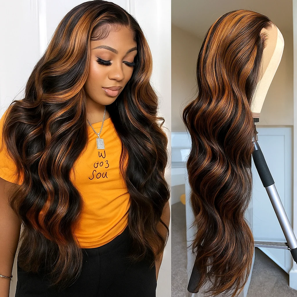 Highlight Ombre Lace Front Wigs Human Hair Body Wave Lace Front Pre Plucked 13x4 1B/30 Brown Highlight Wig 200 Density For Women